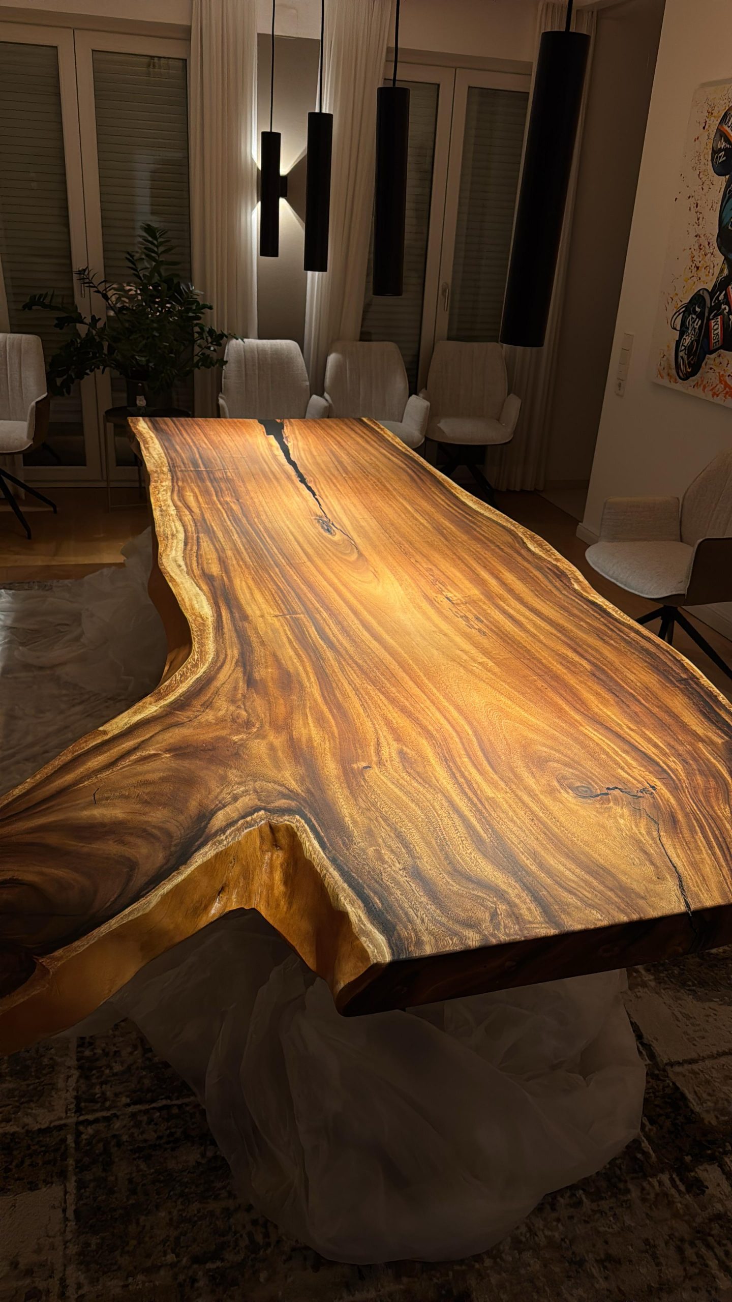 Dieser beeindruckende Tisch aus einem Stück Suarholz bringt die pure Schönheit der Natur in Ihren Wohnraum. Die markante Maserung und organische Form machen jedes Stück zu einem absoluten Unikat. Versiegelt mit einem hochwertigen Spezial-Öl bleibt nicht nur die warme Ausstrahlung des Holzes erhalten – auch die Langlebigkeit ist garantiert. Jeder Tisch entsteht auf Anfrage – ganz individuell für Sie gefertigt.