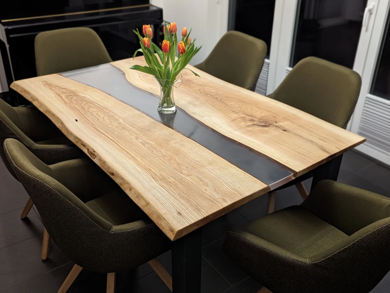 Dieser außergewöhnliche Tisch vereint natürliche Eschebohlen mit stilvollem Epoxidharz zu einem echten Unikat. Mit viel Liebe zum Detail gefertigt, besticht er durch seine organische Form und die harmonische Verbindung aus Holz und Harz. Versiegelt mit einem hochwertigen Spezial-Öl bleibt die natürliche Schönheit des Holzes erhalten – gleichzeitig wird der Tisch optimal vor Abnutzung geschützt.