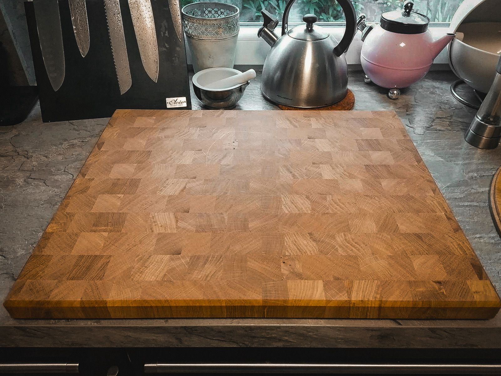 • Handgefertigtes Hirnholz-Schneidebrett aus Eiche oder Lärche